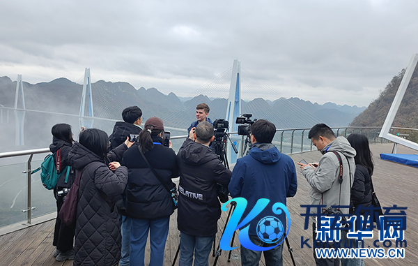 媒体记者在“天外之桥”景区采访。新华网发