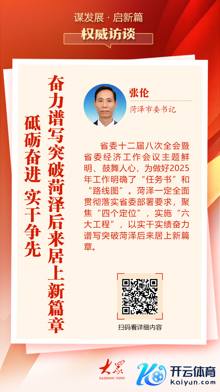 省委十二届八次全会暨省委经济职责会议主题显明、饱读吹东谈主心,为作念好2025年职责明确了“任务书”和“道路图”。菏泽一定全面贯彻落实省委部署条款开云体育(中国)官方网站,聚焦“四个定位”,引申“六大工程”,以实干实绩力图谱写冲突菏泽自后居上新篇章。