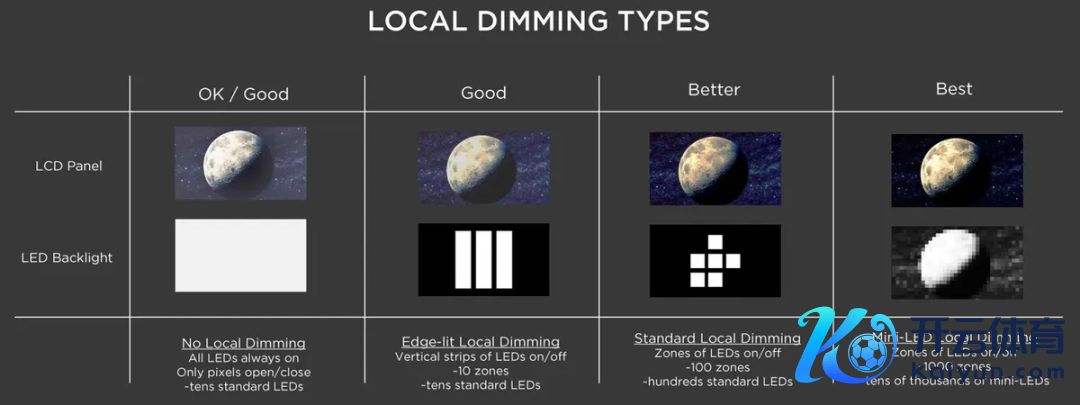 下图从左至右即是传统无局部调光、角落局部调光、传统局部调光和Mini-LED局部调光在瓦解成果和光源成列上的对比。